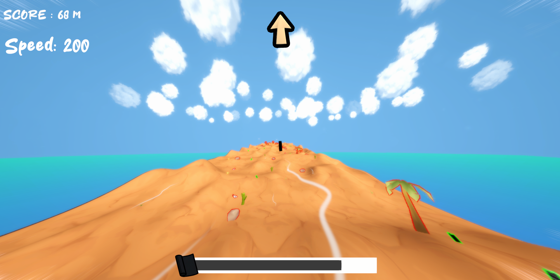 You control a tire that has detached from a car and is now moving through a desert environment. Your objective is to survive as long as possible by managing your rubber amount, which decreases over time and with certain actions. Avoid obstacles, keep your tire stable, and try to last the longest you can.